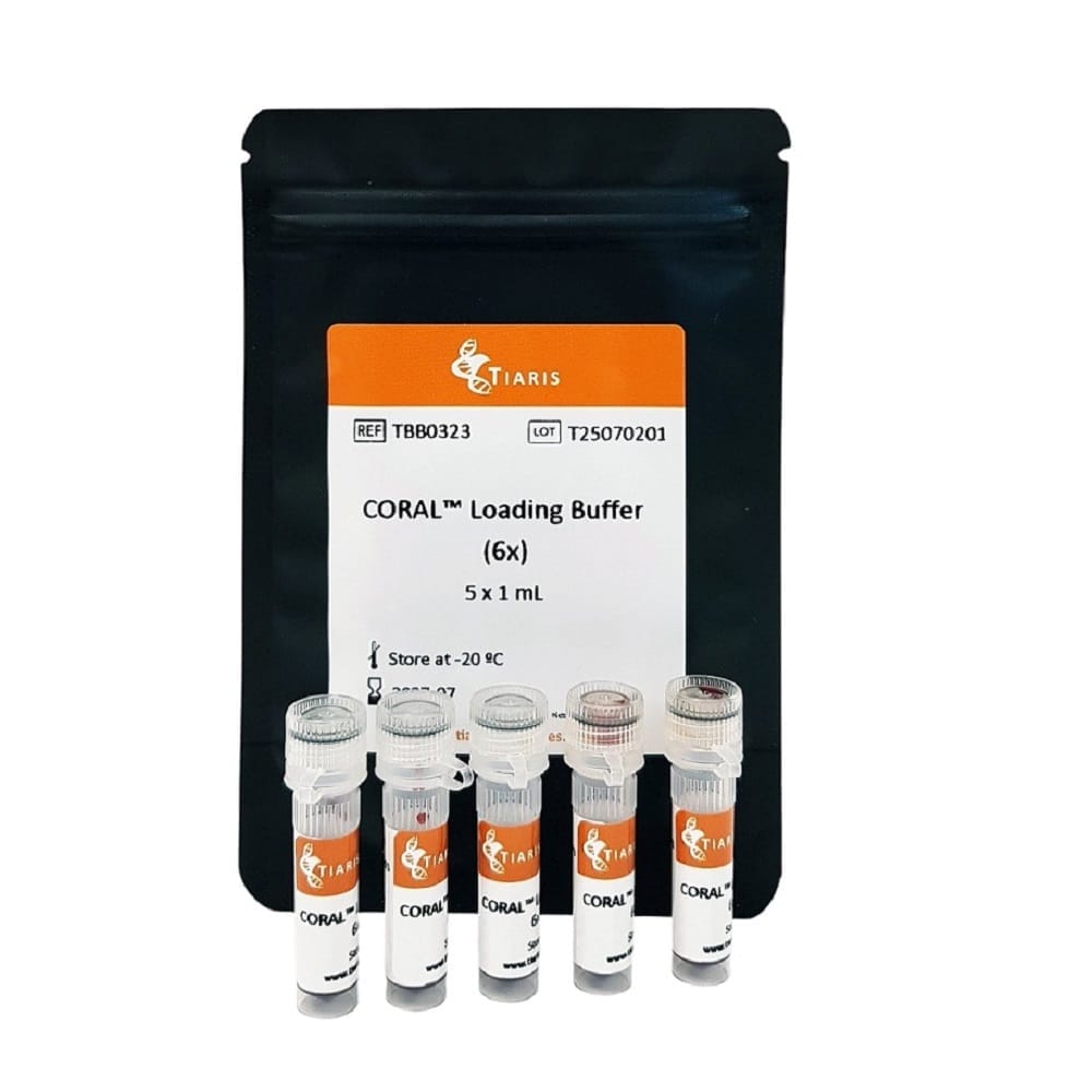GREENY™ Loading Buffer 6x is a DNA/RNA Loading Buffer for easy loading and tracking of samples on agarose gels. It includes glycerol as high density component and a combination of two tracking dyes, xylene cyanol FF and orange G. Xylene cyanol FF migrates at 3030 bp (TBE Buffer) or 4160 bp (TAE Buffer). While orange G migrates in 50 – 80 bp range.